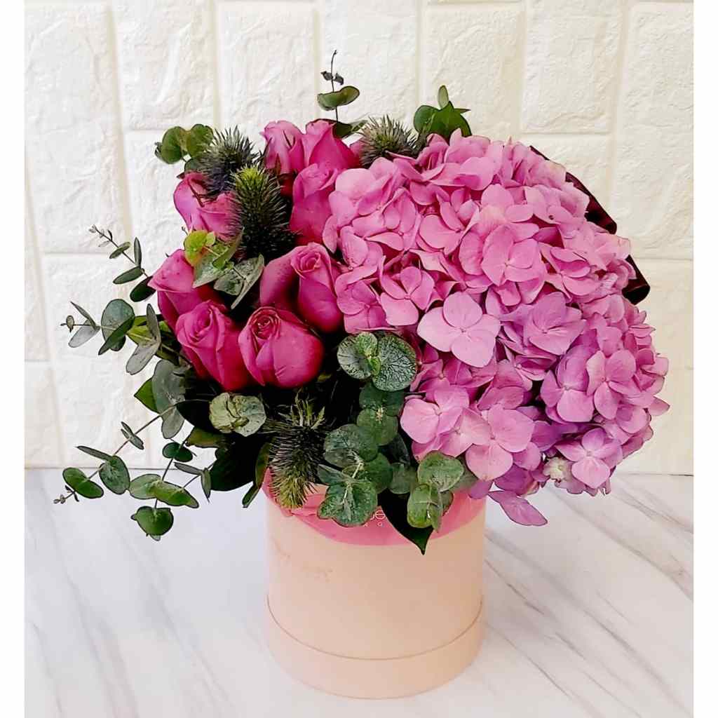 花盒有粉紫色玫瑰、粉紅色繡球花等🌿