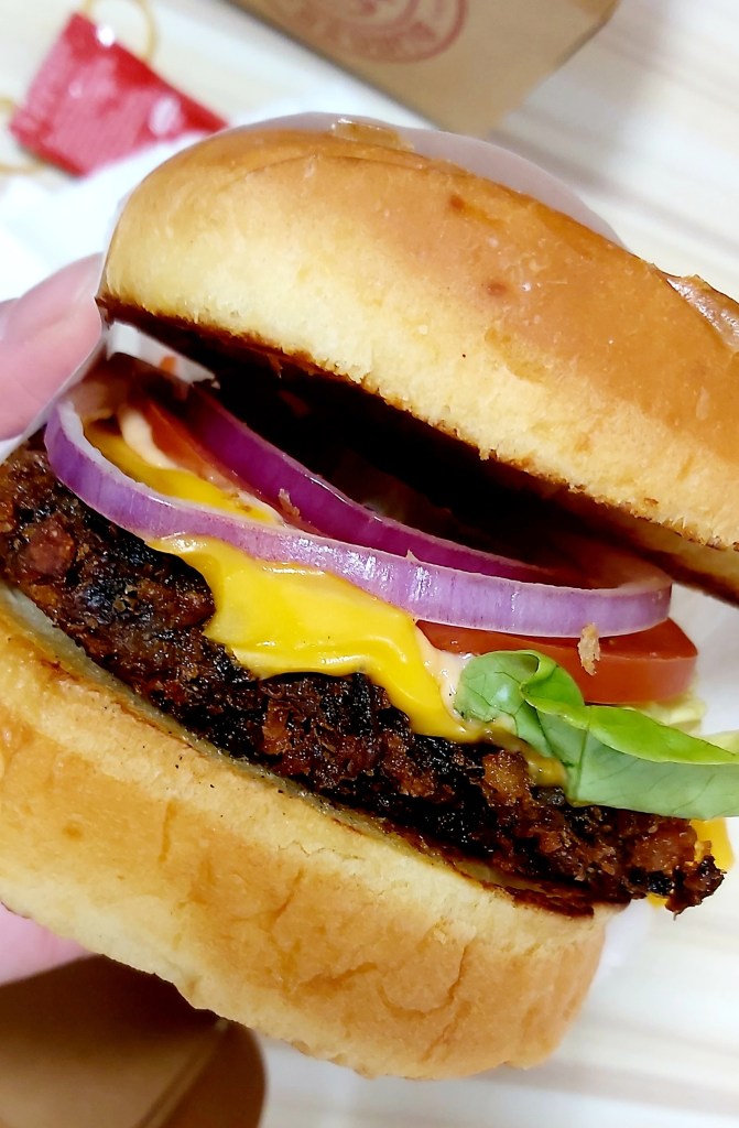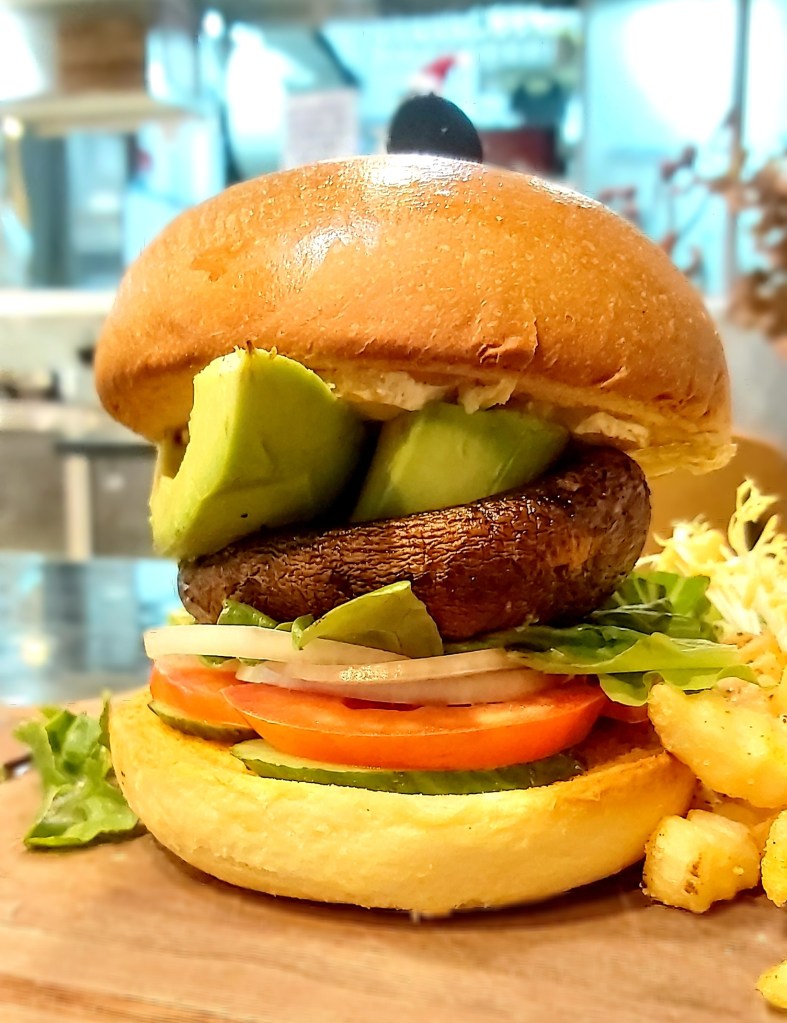 漢堡內有半個熟嘅🥑牛油果🍄大大個大啡菇🥬新鮮蔬菜🧀芝士🧅洋蔥🍅蕃茄🥒青瓜;外層嘅麵包好香脆,質感軟綿綿;真係好有口感😋