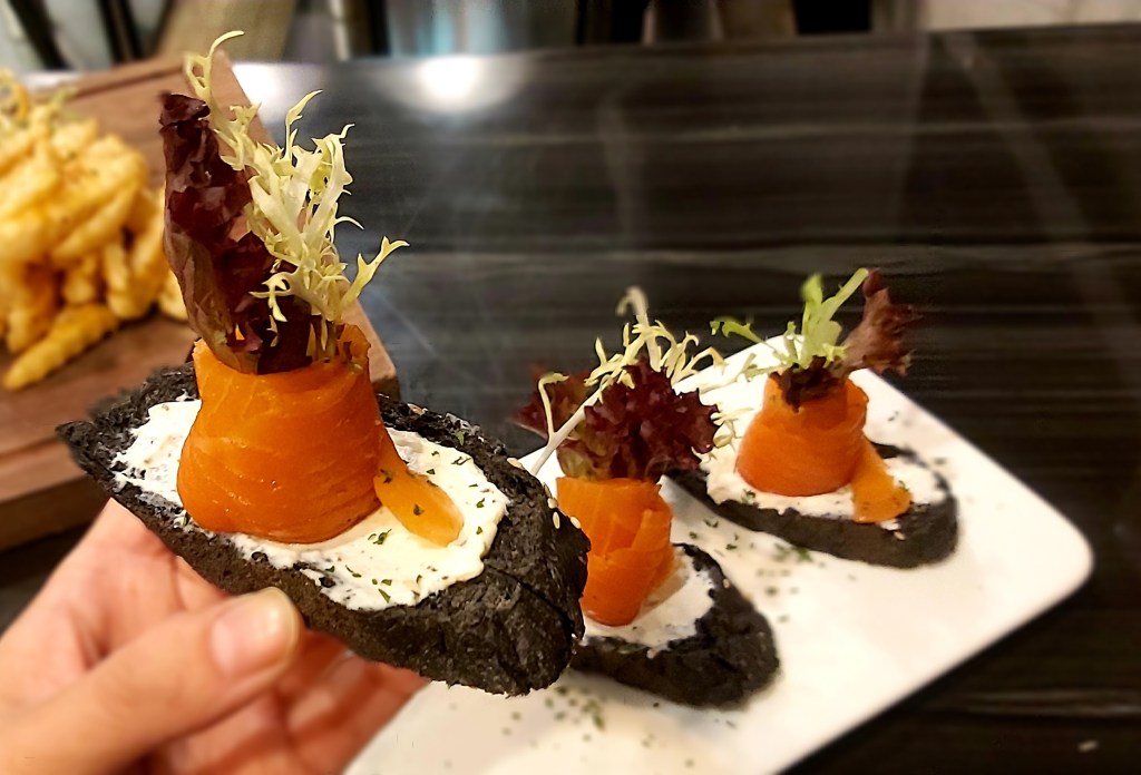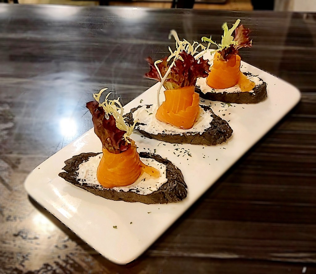 墨汁包小多士好特別🤭不過無墨汁味,香脆小多士🍞;面層搽上Cream cheese;中間係煙三文魚包住沙律菜🥬,好似朵花咁,睇到個樣都好想食